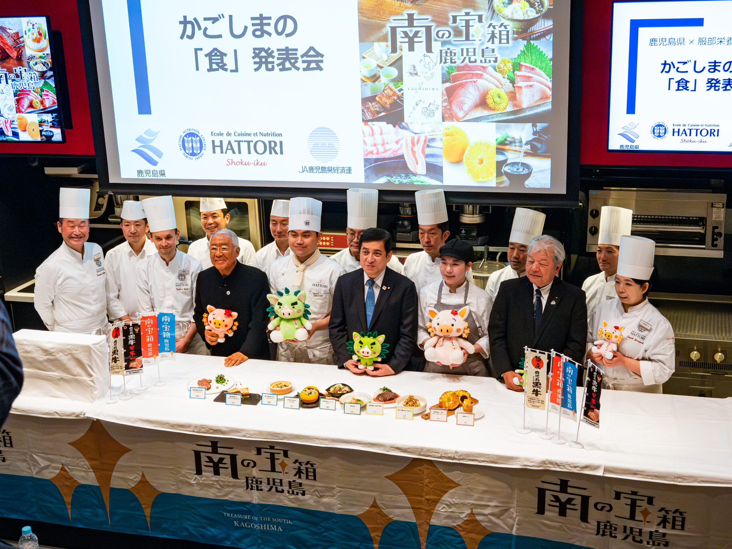 当日は,鹿児島県知事,鹿児島県経済連会長,服部栄養専門学校校長が出席され,鹿児島黒牛など鹿児島県産食材を使用した調理実習を行った学生代表の発表や,服部栄養専門学校の講師が開発した新メニューの試食が行われました。