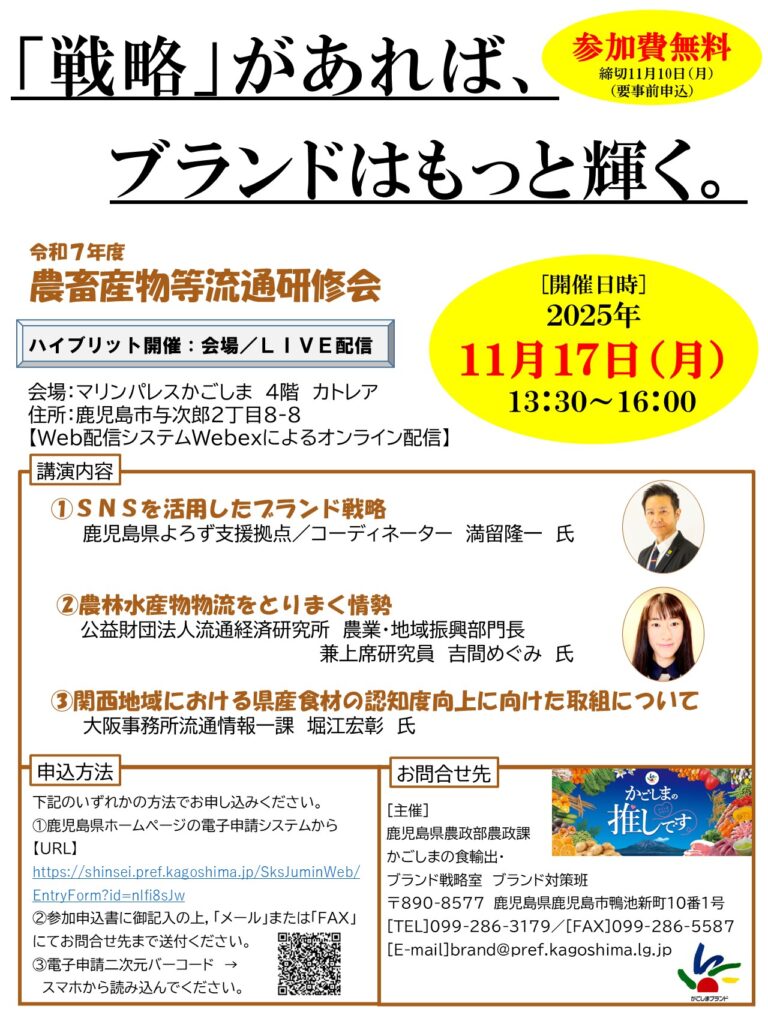 そこで,これらの変化に対応した消費者,実需者側から見た「売れるものづくり」等について学び,マーケットインの発想に基づいた県産農畜産物等の産地づくり,販売力強化を図るための研修会を開催します。