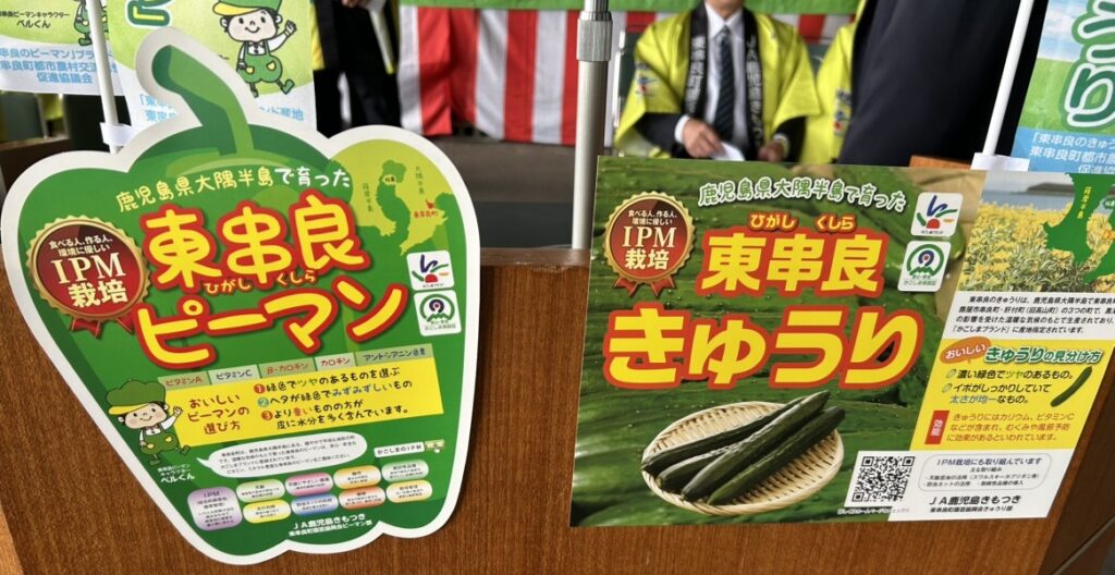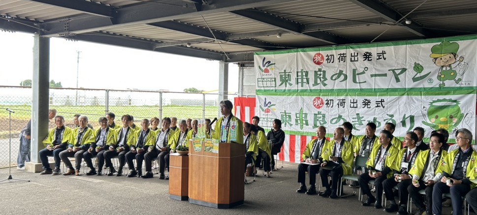 11月4日,JA鹿児島きもつきピーマン選果場で,かごしまブランド産品に認定されている「東串良のきゅうり」と「東串良のピーマン」の初荷出発式が,東串良町園芸振興会の生産者や関係機関・団体約150人が出席し,盛大に開催されました。令和7年産の「きゅうり」と「ピーマン」は,夏場の高温により栽培管理に苦労したものの,台風の被害がなく収穫を迎えました。