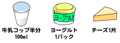 成長期に特に必要なカルシウムを十分にとるためにも、牛乳・乳製品の適量は少し幅を持たせて1日2~3つ(SV)、「基本形」よりもエネルギー量が多い場合では、4つ(SV)程度までを目安にするのが適当です。