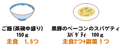 主食,副菜,主菜,牛乳・乳製品,果物の各グループにおいて、「1つ」の料理がどれくらいかを覚えておくと、自分が食べた料理がどのくらいかということがわかります。