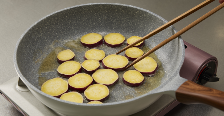 加熱平底鍋,放入奶油,煎炒擦乾水分的地瓜。